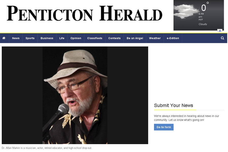 Herald staff May 2, 2017 Allan Markin is the retired Regional Dean of the Penticton Campus of Okanagan College. He has a doctorate in English Literature from the University of Calgary, having also conducted research in the rare books libraries of the British Museum in London and at Yale University. An award-winning actor, he recently released his third CD and is now directing The Man with the Plastic Sandwich for Penticton Chamber Theatre which plays this weekend at The Cannery Stage. He is president of the South Okanagan Performing Arts Centre Society. He has been married to Evelyn for 50 years and they have two grown children.